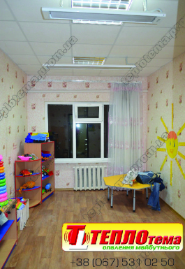 Для цієї мети ми застосовуємо побутовий стельовий нагрівач Home 1200 з терморегулятором: прилад досить потужний, проте його тепловий потік — приємний і м'який, інфрачервоне тепло сприятливо впливає на дитячий організм, покращує як емоційне, так і загальне самопочуття дитини. Крім того,: